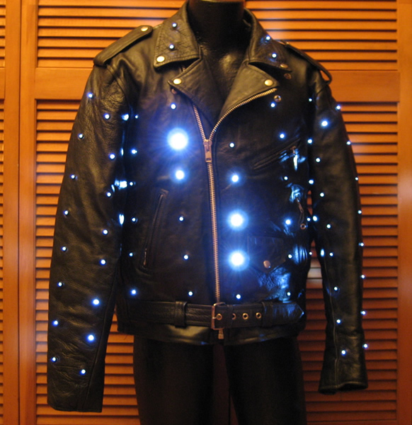 Anima o teu couro com algumas luzes super-branco brilhante! Este casaco de couro preto de moto tem mais de cem LEDs brancos instalados na parte da frente, costas, mangas e gola.